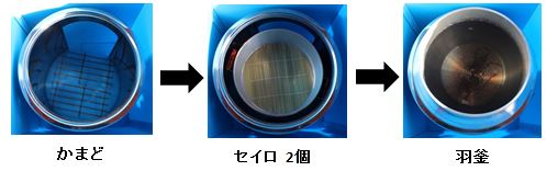 ①かまど→セイロ2個→羽釜を羽釜の中に入れてください。