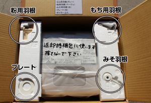 発砲スチロールの形に合わせてもち用羽根、粉用羽根、みそ羽根、プレートを入れてください。