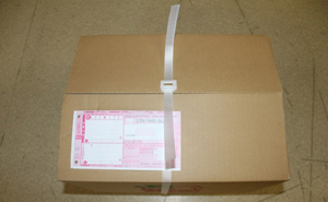 ③出荷伝票(写真左上)下のビニール封筒の中の返却用着払い伝票を、貼り付け位置に貼って送り返してください。(写真右下)